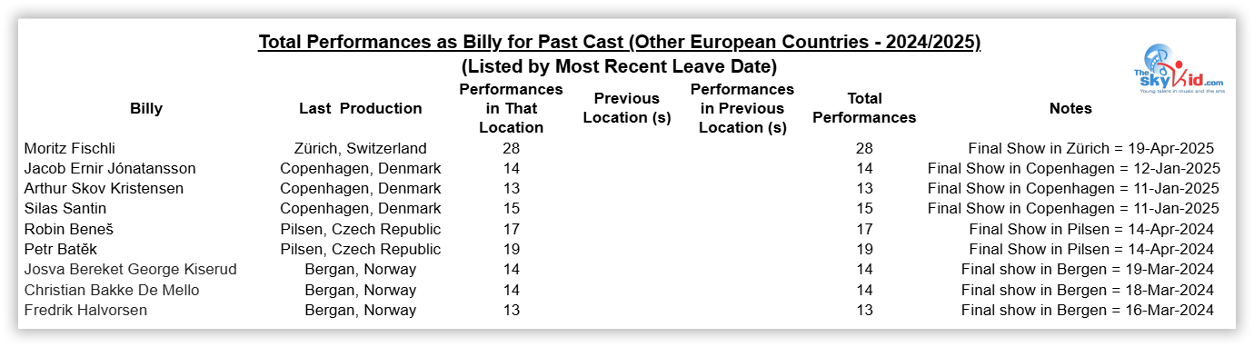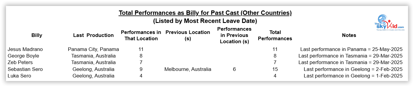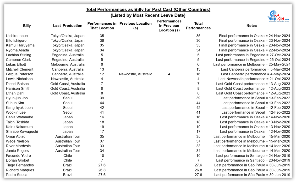 Cumulative totals for Billys who appeared in past productions of the show, sorted by productions in the area of the world where those productions were presented. Please note that where charts are split into years, a past Billy’s information appears in the year of his last show.