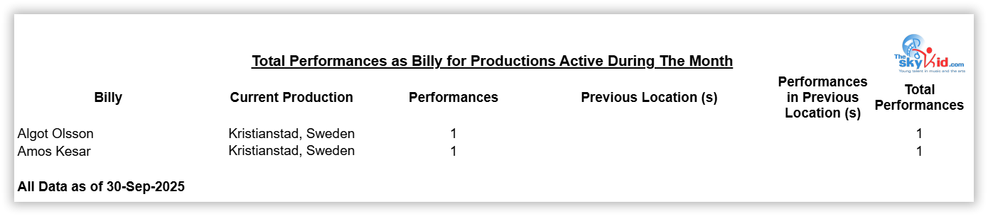 The cumulative total performances for all Billys performing in BETM shows during the month indicated: