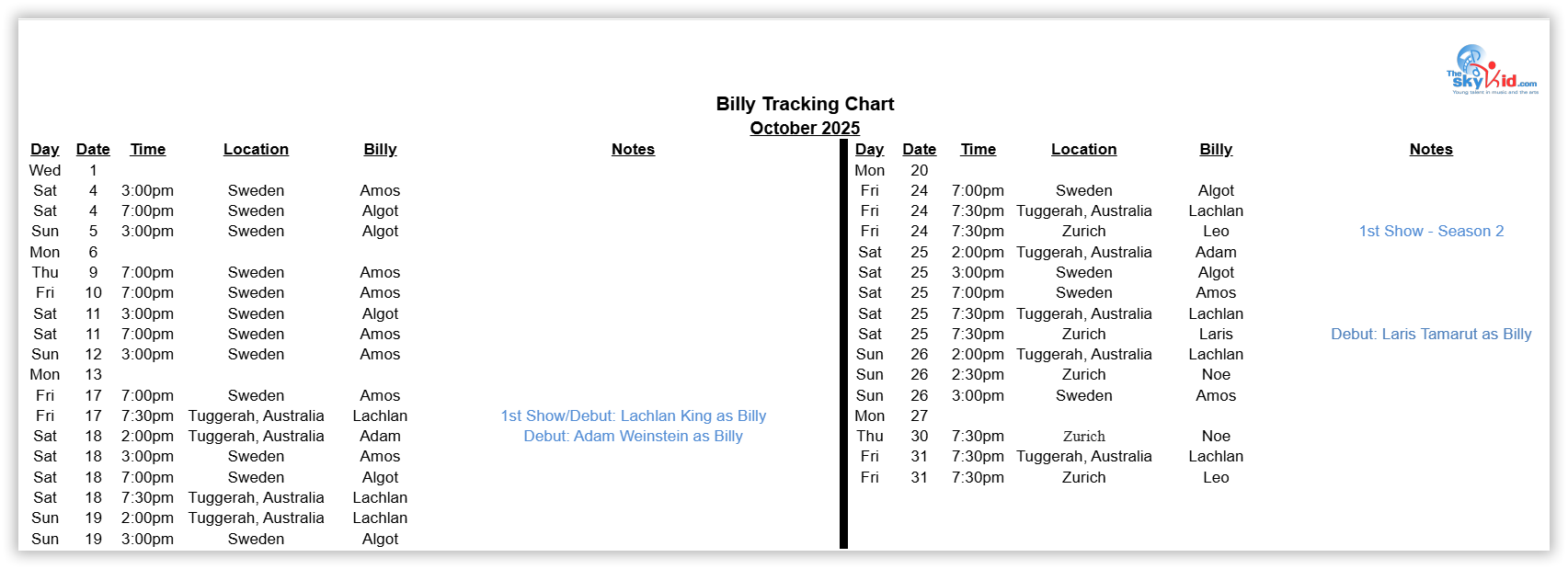 Note that if you would just like to look at the performance info from a particular production, we also track performance information by production for those roles where there are multiple actors cast in them, including the Billys, at the Billy Elliot Forum. You can access that information for productions active in 2025 by clicking on the year links (below):
