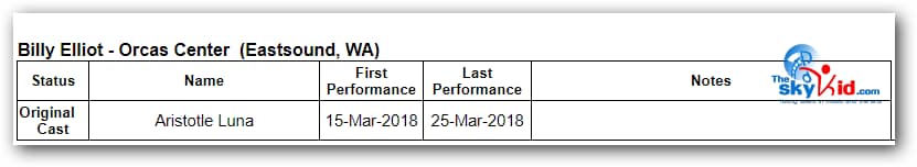 Meet Billy Elliot: Orcas Center (WA) Billy Elliot The MusicalBilly Profiles - By LocationNorth American Regional Productions FacebookXPinterestWhatsAppEmailViber The Orcas Center Cast Information The cast of BETM at the Orcas Center is led by Aristotle Luna in the role of Billy. Billy Michael Debbie Mrs W Dad Tony Grandma Aristotle Luna (Billy), Tiffany Spring Loney (Mrs. Wilkinson) and Don Yerly (Mr. Braithwaite) rehearse “Born to Boogie” Dead Mum Mr B George Tall Boy Small Boy Aristotle Luna (Billy) poses with some of the Ballet Girls Ballet Girls Ensemble Members of the Cast To Cast Information for All Billy Productions To The Orcas Center Main Page TagsAristotle LunaBilly Elliot The MusicalOrcas Center FacebookXPinterestWhatsAppEmailViber Previous articleMeet Billy Elliot: Aristotle LunaNext articleMeet Billy Elliot: Tancredi di Marco OTHER NEWS Billy Elliot The Musical Meet Billy Elliot: Alphabetical Profile Index Billy Elliot The Musical Meet Billy Elliot: Kwinana, Australia Billy Elliot The Musical Meet Billy Elliot: Lucas Johnson Billy Elliot The Musical Meet Billy Elliot: Port Macquarie, NSW, Australia Billy Elliot The Musical Meet Billy Elliot: Sam Moore Billy Elliot The Musical Meet Billy Elliot: Lachlan King