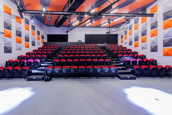 The theatre features a sleek black box design that provides a versatile canvas for any performance, from intimate one-man shows to grand ensemble productions. The retractable seating system is the perfect solution for creating an intimate atmosphere, allowing the audience to feel like they are part of the performance. The theatre seats 144 and is equipped with state-of-the-art sound and lighting facilities.