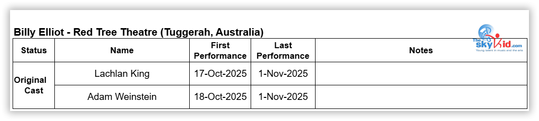 A 38 member cast will be led by two boys taking turns at starring in the lead role of Billy Elliot. They are Lachlan King and Adam Weinstein.