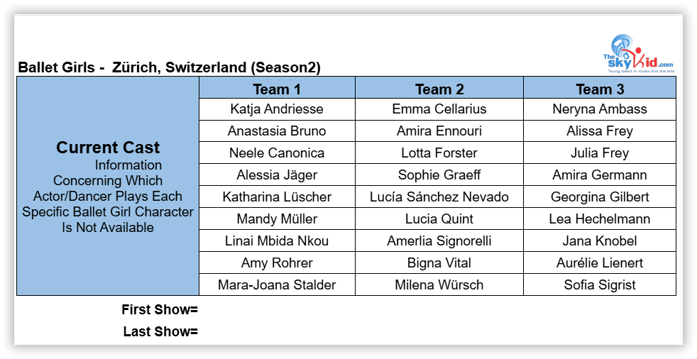 Note: While the girls regularly perform in their own groups as indicated on the charts (below), occasionally a girl may perform with another team if necessary to cover for a regular team member’s absence.